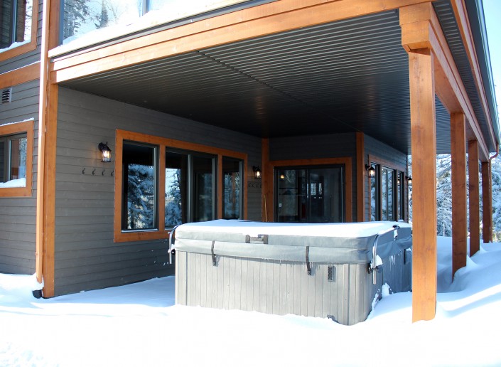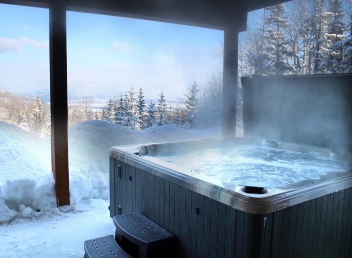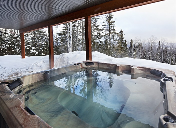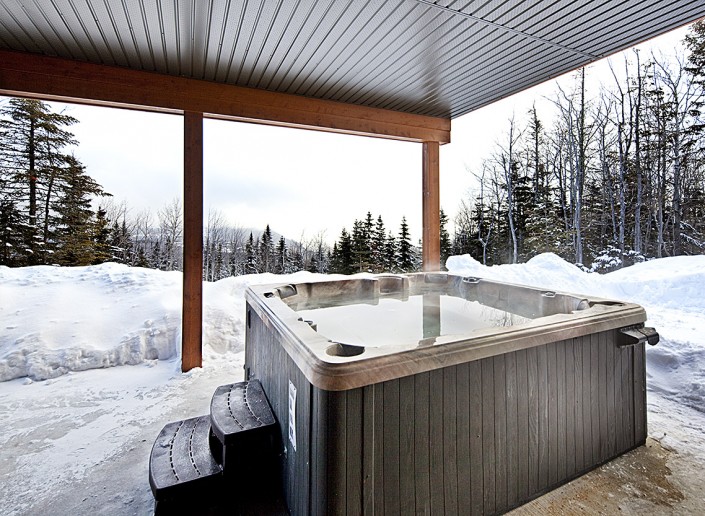 Le spa extérieur 4 saisons, protégé par la grande terrasse, offre des moments de détente peu importe les intempéries.