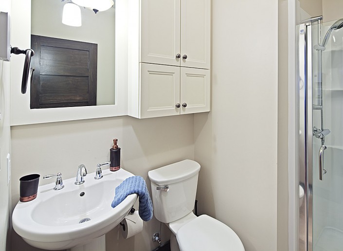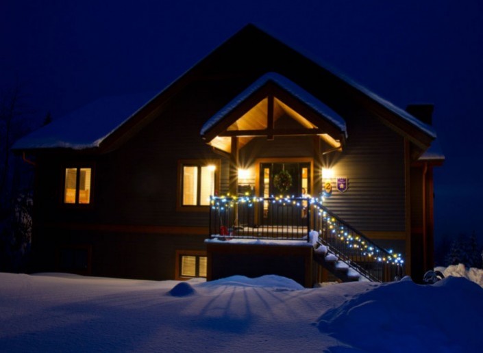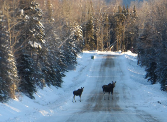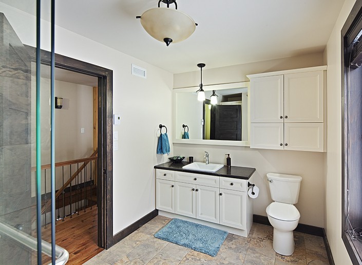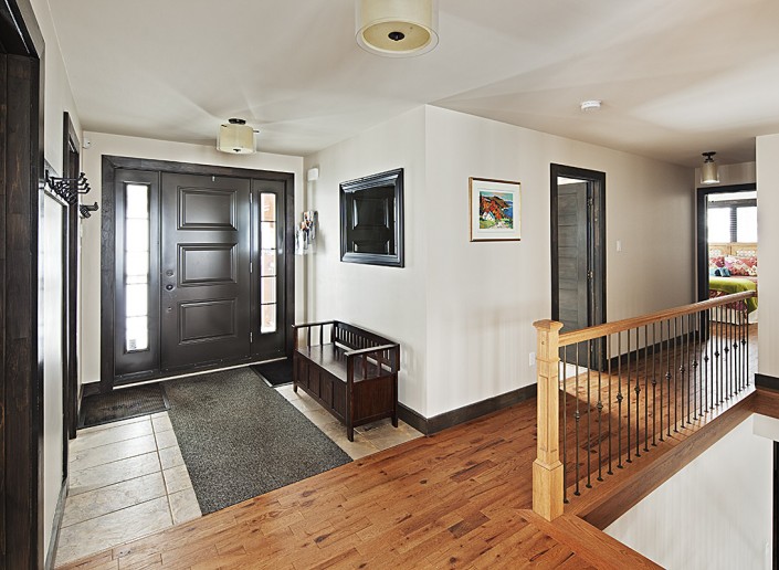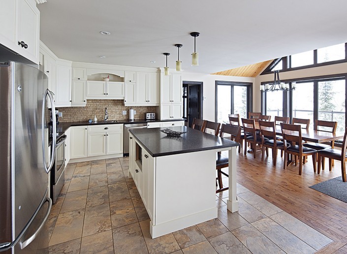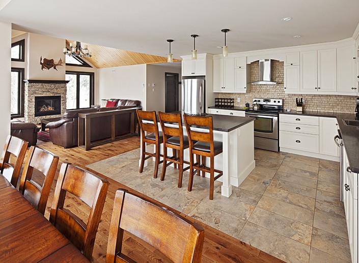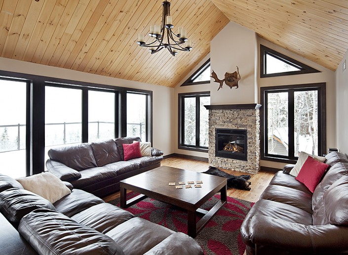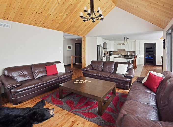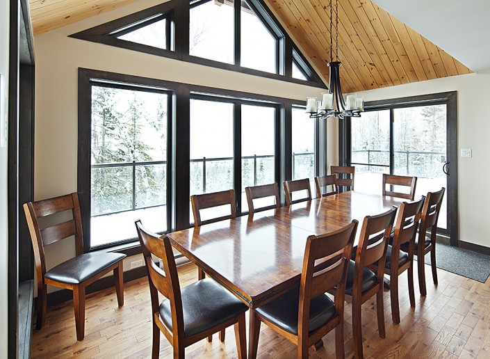 Le salon principal et la salle à dîner, largement fenestrés ont un plafond cathédrales en pin noueux. Le salon est équipé d’un foyer au propane, d'une télé écran plat de 50", orné d’un panache d’orignal, récoltés par les propriétaires.