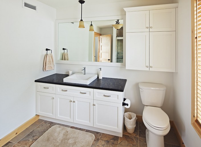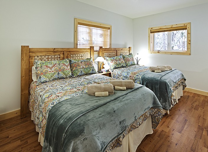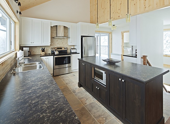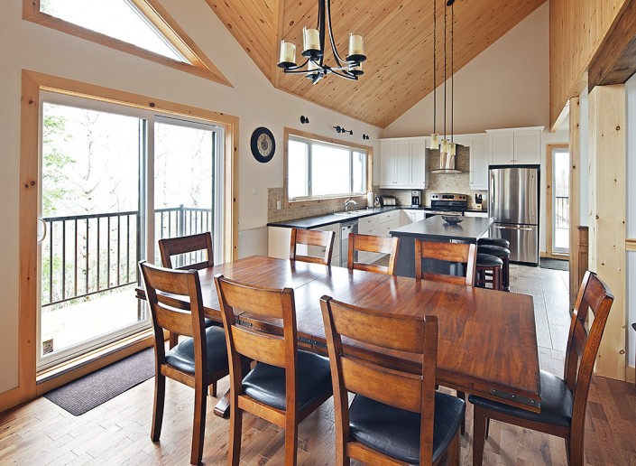 Le salon principal, largement fenestré avec double toits cathédrales en pin noueux, est équipé d’un foyer au propane, d'une télé 50 pouces et orné d’un panache d’orignal chassé par les propriétaires.