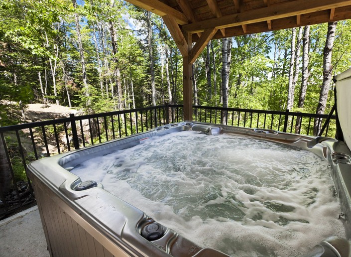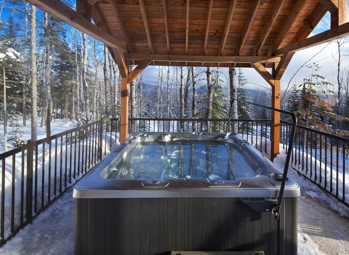 Le spa extérieur protégé par une structure cathédrale en bois massif offre des moments de détente, peu importe les intempéries.