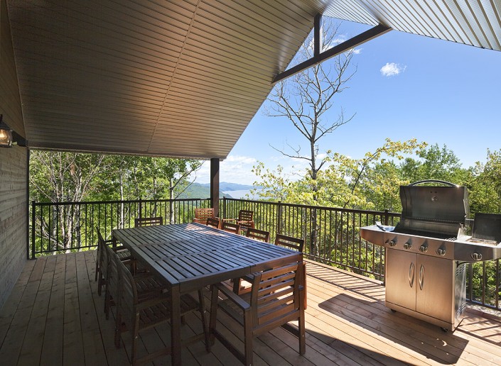 La terrasse belvédère couverte, équipée d’un BBQ, de tables et chaises en bois d’acacia, vous permet de profiter plus longuement de la belle saison.