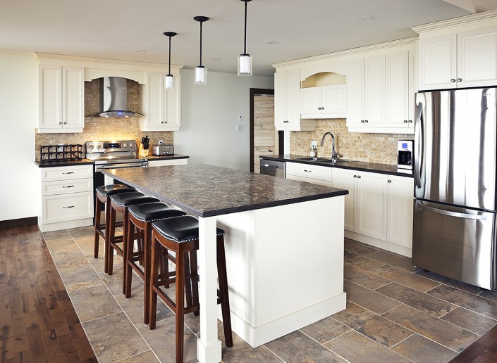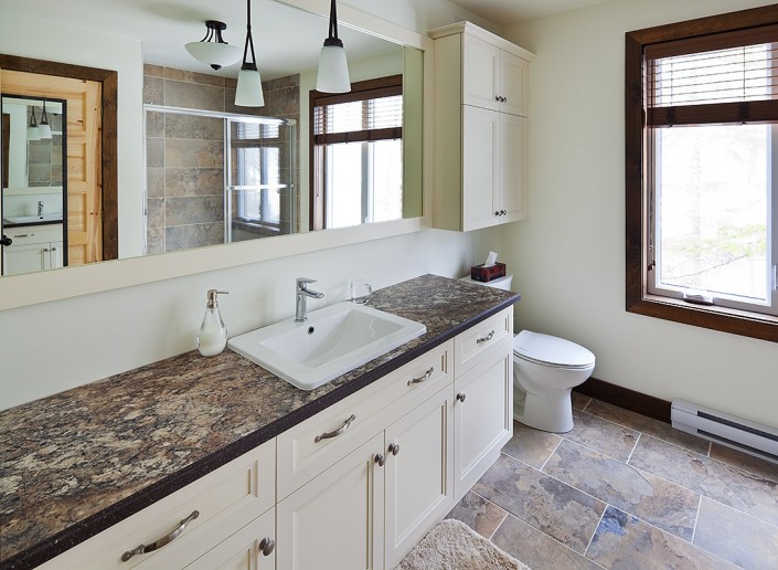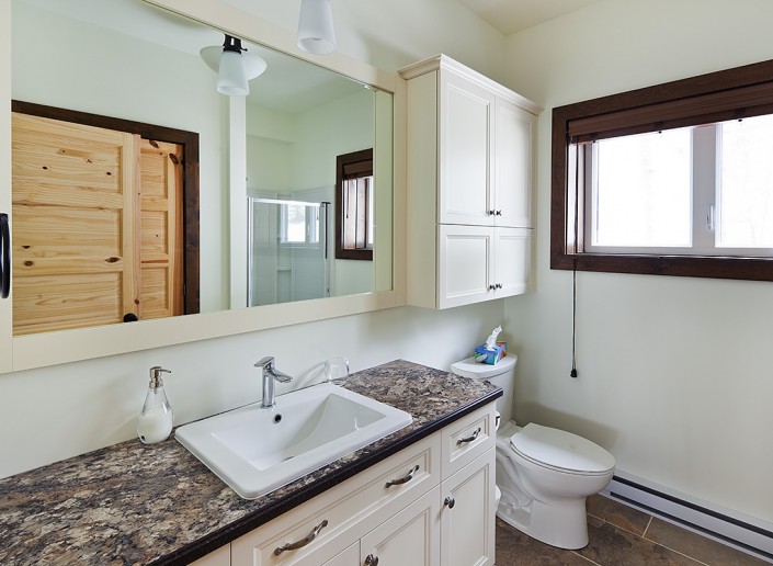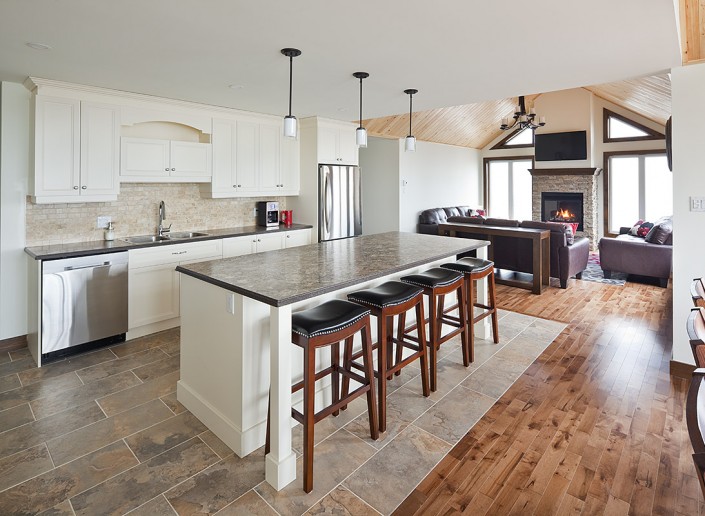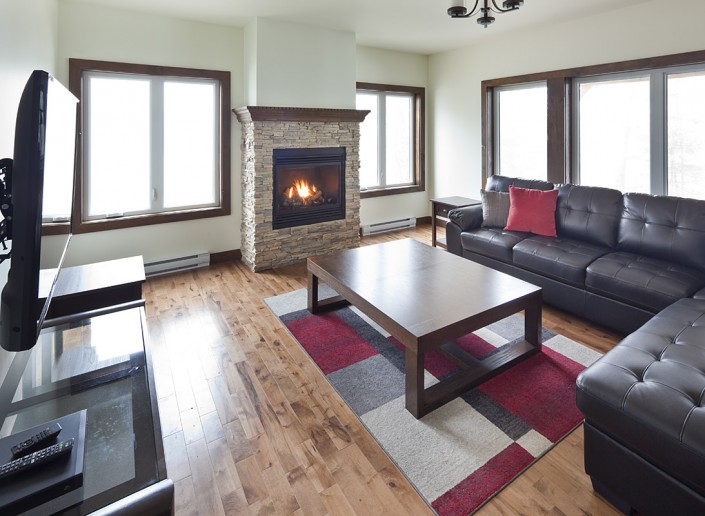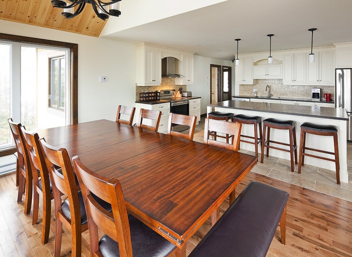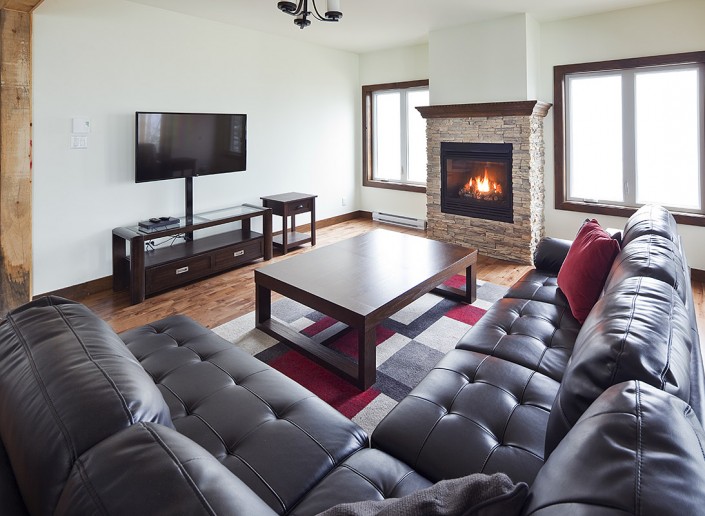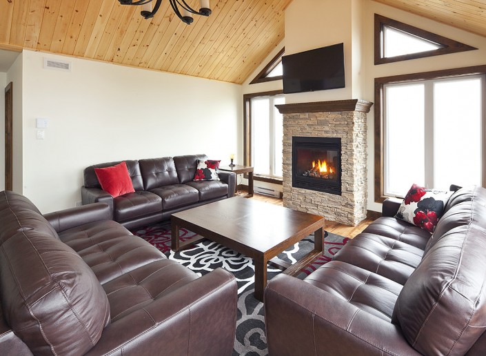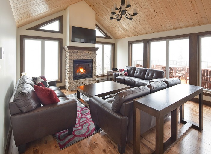 Le salon principal et la salle à dîner, largement fenestrés ont un plafond cathédrales en pin noueux. Le salon est équipé d’un foyer au propane et d'une télé écran plat 50"