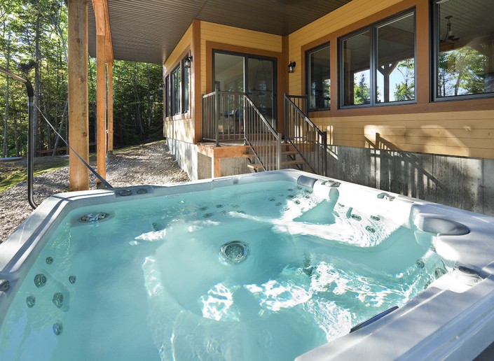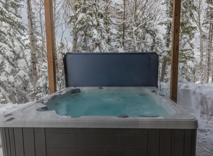 Le spa extérieur 4 saisons, protégé par la grande terrasse, offre des moments de détente peu importe les intempéries.