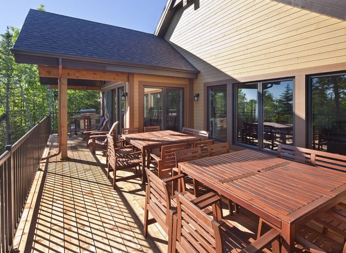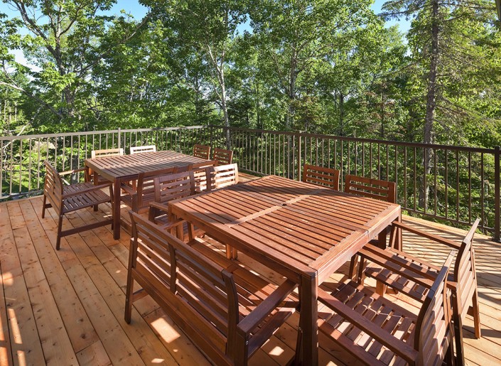 La terrasse belvédère, en partie couverte, offre une vue imprenable sur le fleuve St-Laurent ainsi que sur l’île-aux-Coudre ! Elle est équipée d’un BBQ, de tables et chaises en bois d'acacia. Ses chaises Adirondacks sont idéales pour le café du matin ou l’apéro du soir !