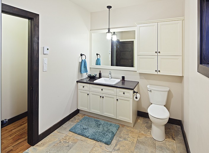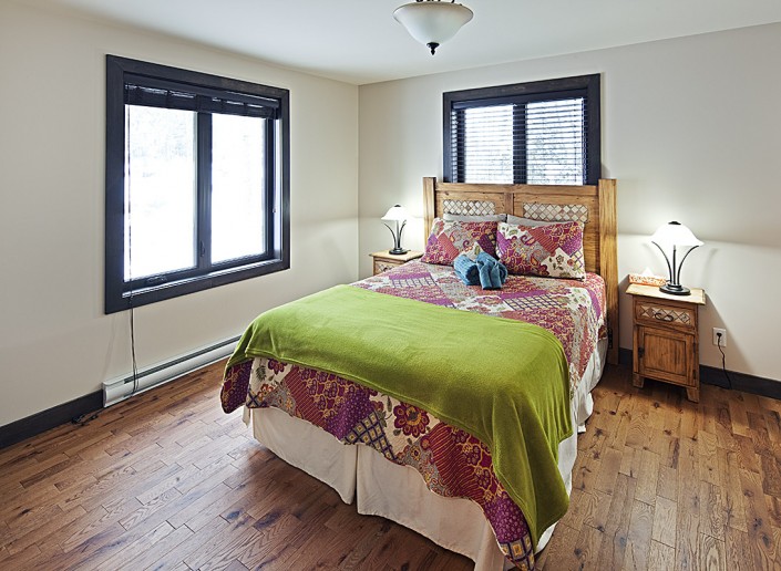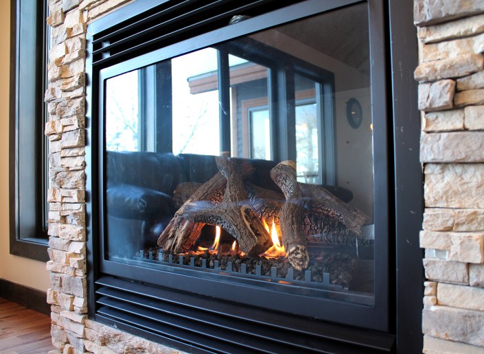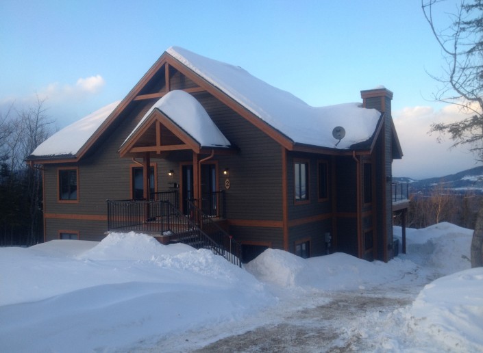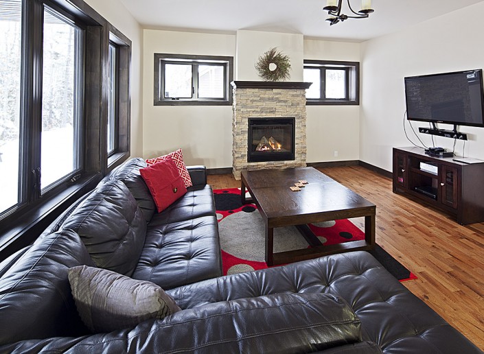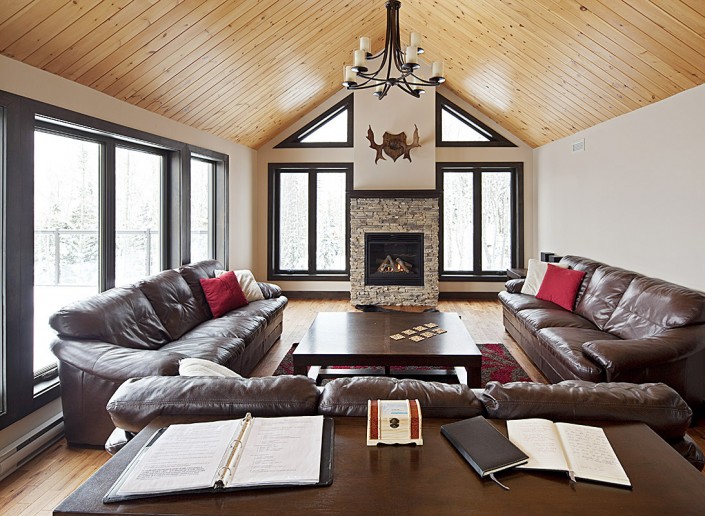 Le salon principal et la salle à dîner, largement fenestrés ont un plafond cathédrales en pin noueux. Le salon est équipé d’un foyer au propane, d'une télé écran plat de 50", orné d’un panache d’orignal, récoltés par les propriétaires.