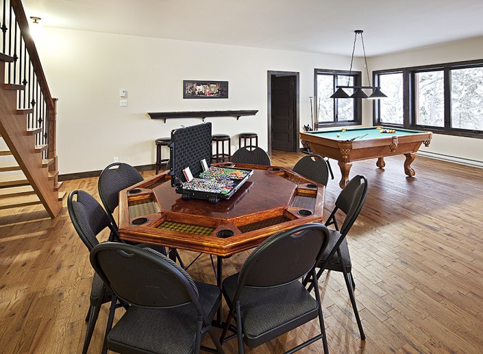 Le 2ème salon au rez-de-jardin, est équipé d’un grand modulaire en cuir, d’une télé écran plat 50 ‘’ avec système de son, d’un lecteur dvd blu-ray , d’une table de poker pour 8 personnes (fabriquée par les propriétaires), ainsi que d’une table de billard, vous permet de vous amuser pleinement !