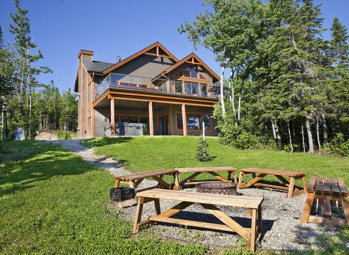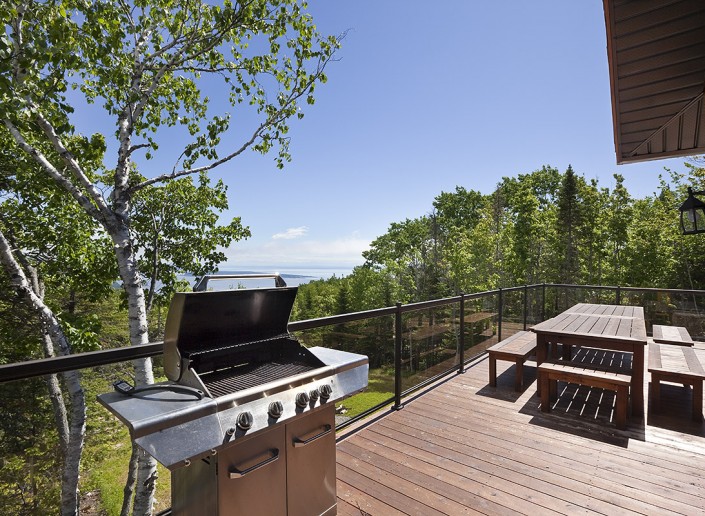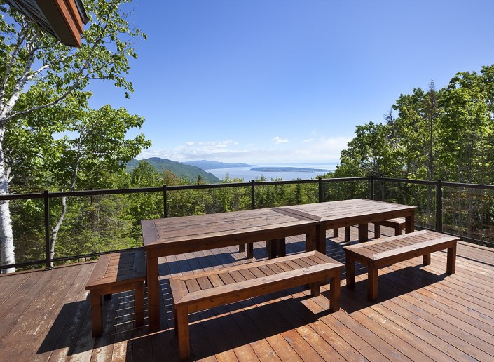 La terrasse belvédère offre une vue imprenable sur le fleuve St-Laurent ainsi que sur l’île-aux-Coudre ! Elle est équipée d’un BBQ, de tables et chaises en bois de cèdre. Ses chaises Adirondacks sont idéales pour le café du matin ou l’apéro du soir !