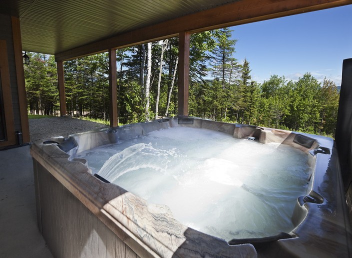 Le spa extérieur 4 saisons, protégé par la grande terrasse, offre des moments de détente peu importe les intempéries.