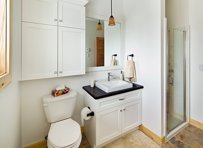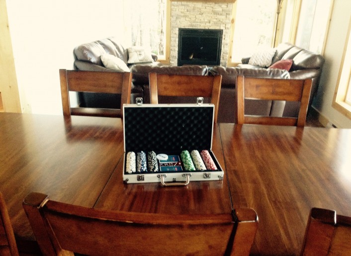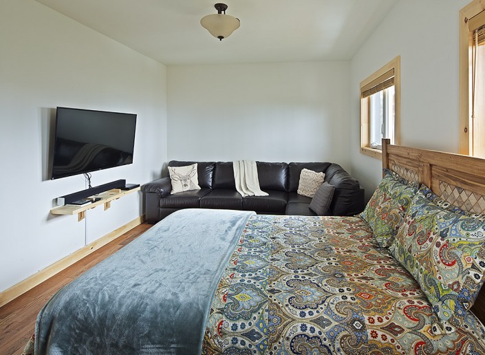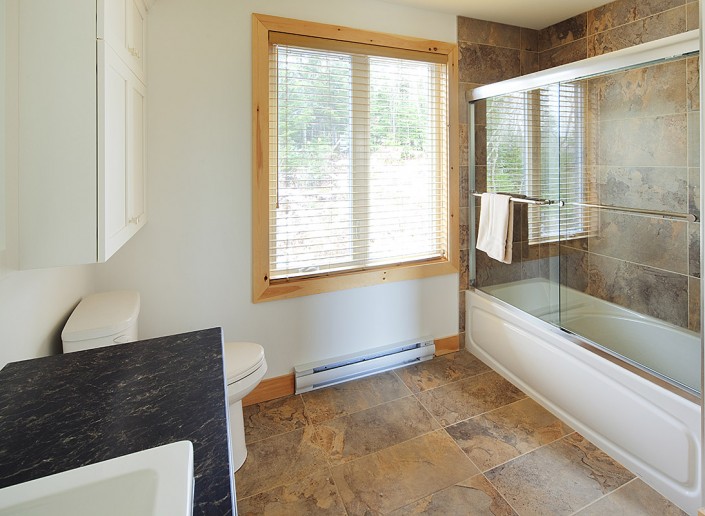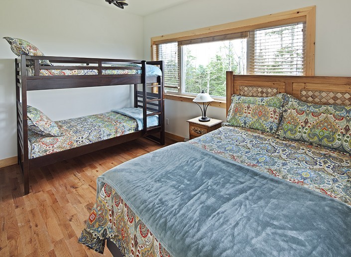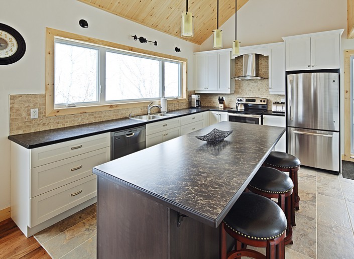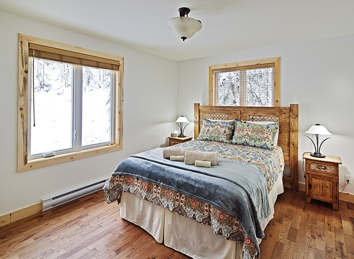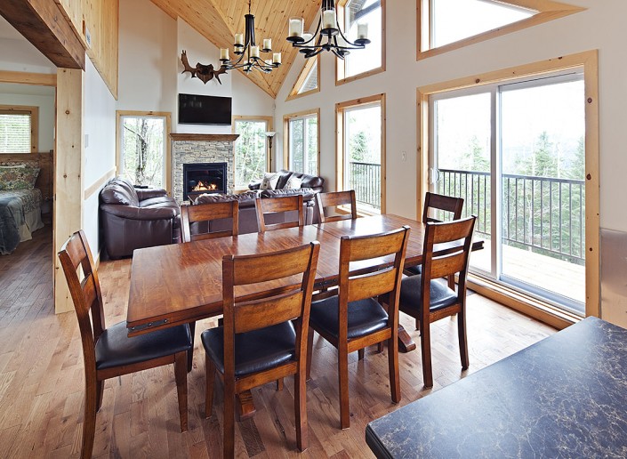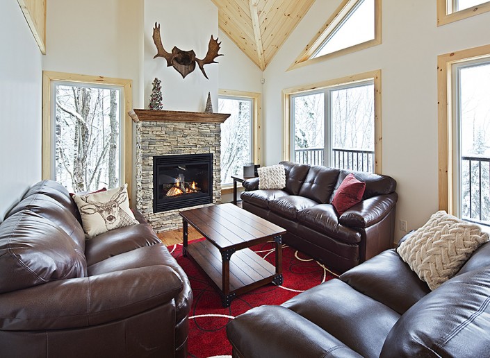 Le salon principal, largement fenestré avec double toits cathédrales en pin noueux, est équipé d’un foyer au propane, d'une télé 50 pouces et orné d’un panache d’orignal chassé par les propriétaires.
