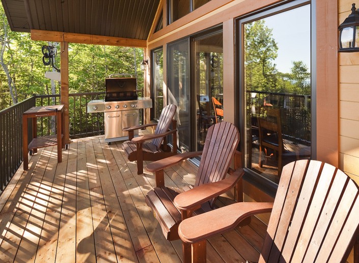 La terrasse belvédère, en partie couverte, offre une vue imprenable sur le fleuve St-Laurent ainsi que sur l’île-aux-Coudre ! Elle est équipée d’un BBQ, de tables et chaises en bois d'acacia. Ses chaises Adirondacks sont idéales pour le café du matin ou l’apéro du soir !