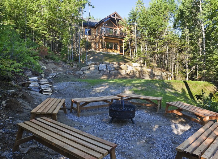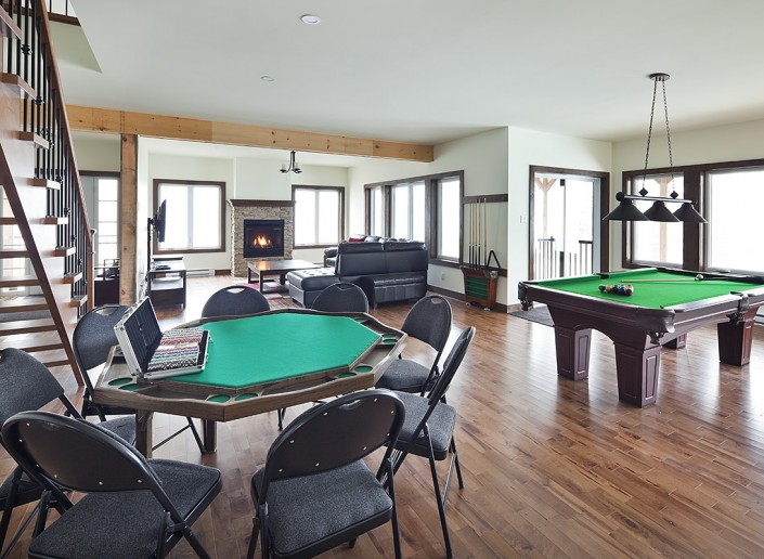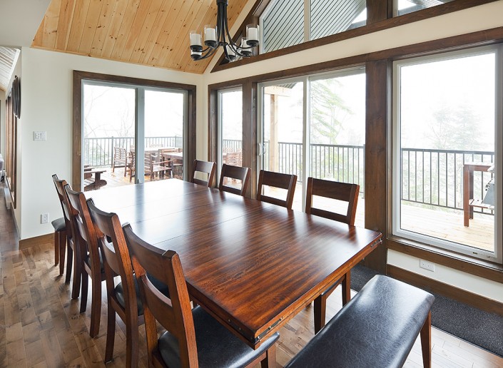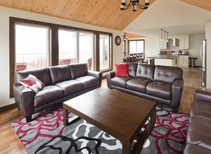 Le salon principal et la salle à dîner, largement fenestrés ont un plafond cathédrales en pin noueux. Le salon est équipé d’un foyer au propane et d'une télé écran plat 50"